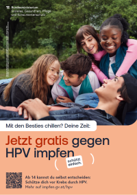 Jetzt gratis gegen HPV impfen. Schützt einfach. Mit den Besties chillen. – Plakat ↗